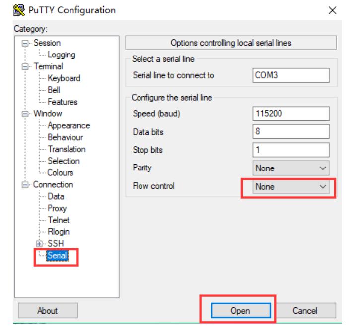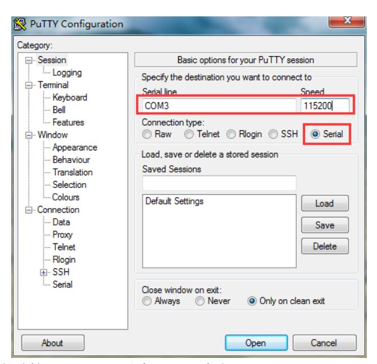在进行串口调试与系统观察前,务必在主机上安装相应的 USB 转串口驱动(即 CP210x_Windows_Drivers.zip),驱动安装完成后使用红色 USB 线将主机的 USB 端口與开发板的 UART(J7)连接并在设备管理器中确认对应的串口号(例如 COM3),其主要功能是建立可靠的串口通道以便接收 U-Boot 与 Linux 的启动信息并在出现问题时进行交互式调试。完成驱动安装并连接串口后,可使用常见的终端工具(如 PuTTY、Tera Term、SecureCRT 等)进行调试,推荐使用已提供的便携版 putty.exe。使用终端时应选择“Serial”模式并填写对应的串口号与波特率(例如 Serial line: COM3,Speed: 115200),将流控(Flow control)设置为 None,然后打开串口会话;终端软件的主要功能是在主机上模拟串口终端以接收并保存开发板的控制台输出、发送命令并在引导或内核阶段进行交互操作。