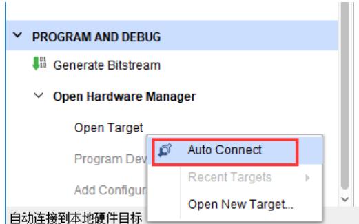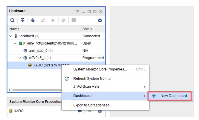 硬件方式的流程为将开发板上电并连接 JTAG 下载器,设置设备为 JTAG 模式后在 Vivado 的 Hardware Manager 中执行 Auto Connect 并确认硬件连接成功,然后在 Hardware Manager 中找到 XADC 设备并右键创建仪表盘(Dashboard),按需添加温度或电压显示项;该方法的主要功能是为开发与调试提供直观的实时曲线与界面交互,便于快速定位异常,但不适合批量自动化采集或后续数值统计(无法直接导出结构化的历史数据供程序处理)。