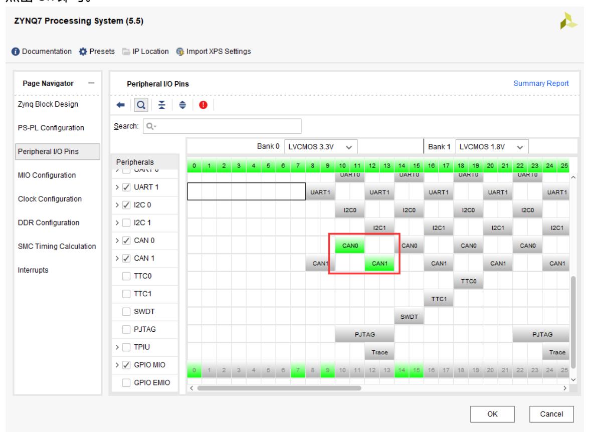 以现有 Vivado 工程 ps_hello 为基础将工程另存为 ps_can 并在 Block Design 中打开 Zynq 处理系统配置,启用 CAN0 与 CAN1 外设并确认配置后保存设计,随后运行 Generate Output Products 并导出硬件平台(不包含 bitstream)以便在 SDK 中进行软件开发与调试;此步骤的主要功能是确保软件端获得正确的外设映射与地址资源,从而能够在运行时通过 PS 访问并配置 CAN 控制器。