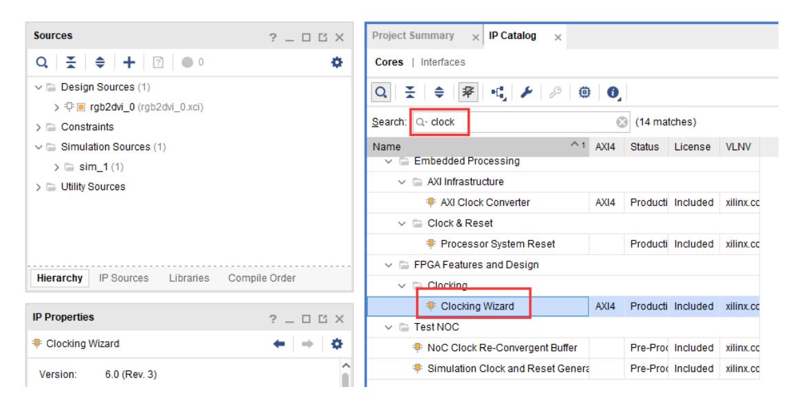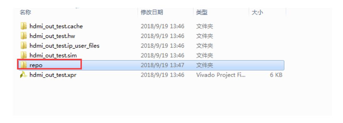 在实现 HDMI 功能时,主要包含 RGB 到 TMDS 的视频编码、像素时钟与其倍频时钟生成、彩条发生器及顶层封装等模块。若使用第三方或自定义 IP,应将相应 repo 文件夹拷贝到工程目录,并通过 IP Catalog 的 Add Repository 将其加入 Vivado 的 IP 搜索路径,随后生成 Output Products 以便在工程中实例化使用。