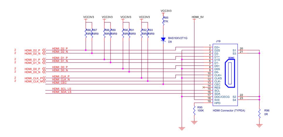 关于 HDMI 接口的硬件设计,HDMI 接口包含三路 TMDS 差分数据通道、差分时钟对、若干供电与控制引脚(如 +5V、GND、HPD 以及 I²C 的 SCL/SDA),在本开发实践中主要关注 TMDS 差分对的正确映射与电平标准、以及供电与地的可靠连接。下图展示了 TMDS 数据通道、电源地以及控制信号的逻辑关系与管脚分配示意,便于在设计约束中正确标注差分对并校验电气特性。